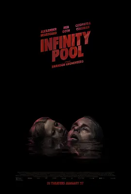 《无边泳池》(Infinity Pool) 是一部由布兰登·柯南伯格(著名导演大卫·柯南伯格之子)执导的悬疑惊悚犯罪片。影片讲述了作家詹姆斯(亚历山大·斯卡斯加德 饰)和妻子艾米在一个原始且奢华的孤岛度假村享受假期。在结识了神秘女子加比(米娅·高斯 饰)后,两人走出度假村,却意外卷入一场车祸事故。在这个奉行“零容忍”政策的异域文化中,他们发现富人可以通过克隆替身来代替自己被处决,从而逃脱法律制裁。然而,这项特权将詹姆斯带入一个充满享乐主义、暴力和身份危机的人性炼狱。